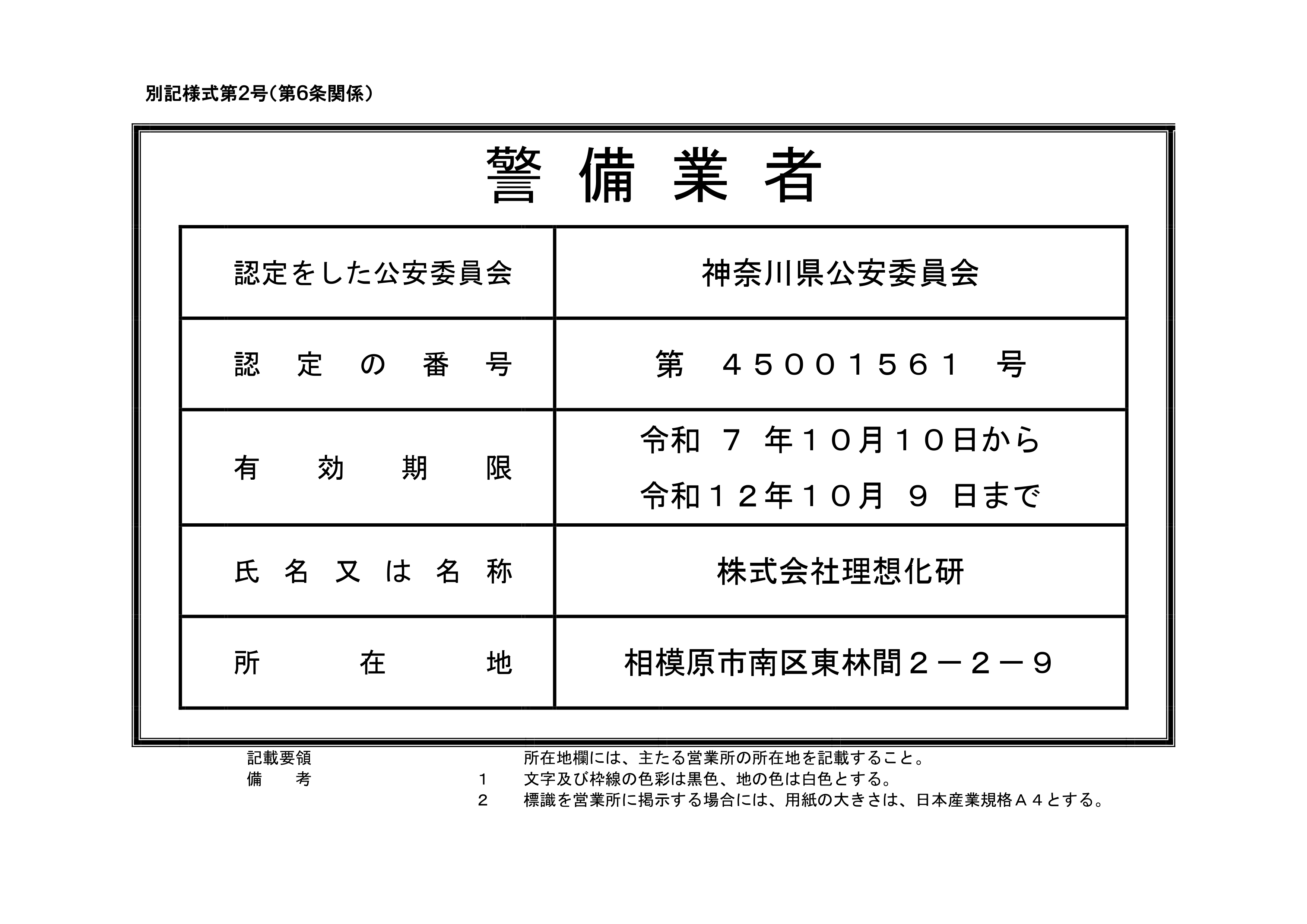 当社は、警備業法に基づき認定を受けた警備会社として、施設警備および交通誘導警備を中心に、 安全で信頼性の高い警備サービスを提供しております。